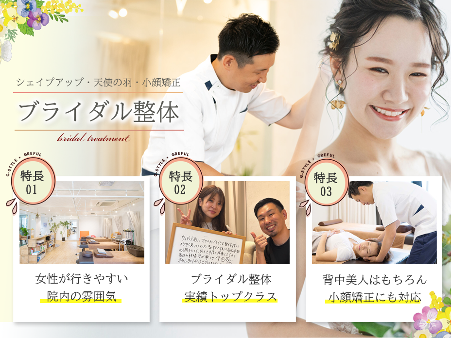 特にウエディングドレスを綺麗に着こなすうえで体の歪みや姿勢は重要なポイントになるため、花嫁様のお悩みのなかにはブライダルエステよりも国家資格者によるブライダル整体のほうが適している場合も多くみられます。