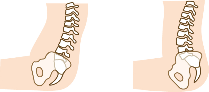 一方、右側のイラストのように骨盤を立てる座り方をすると、自然と背筋が伸びて姿勢のよい座り方になります。骨盤を立てる座り方は簡単で、座るときにお尻を後ろに突き出すように座ってみてください。
