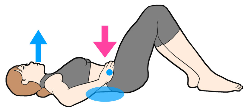 腹式呼とは、お腹をふくらませるように息を吸い、へこませながら吐く呼吸法で、横隔膜をしっかりと動かすのがポイントです。ベッドや床に仰向けになり、両手をお腹に置いて「吸ったときに手が持ち上がる」「吐いたときに沈む」を意識するドローインを行うと腹式呼吸のイメージがつかみやすいためおすすめです。