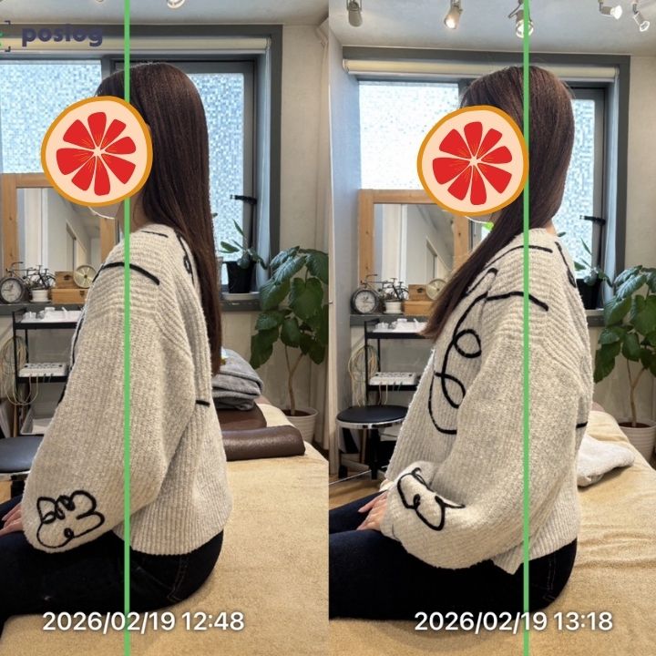 施術後は、自然に胸が開き、首が長く見える姿勢へ変化しました。「背中がスッと伸びた感じがする」「肩甲骨の位置が違う」とご本人も変化を実感されました。前撮りは良いコンディションで迎えることができ、その後も挙式に向けて段階的に整えていく予定です。