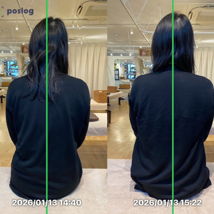 見た目だけを一時的に変えるのではなく、姿勢の土台となる骨盤と背骨の配列、肩の位置、股関節と脚の使い方を根本から整えることを目的に施術を行いました。骨盤と脊椎のバランスを調整し、巻き肩にアプローチしながら、頚肩背部の緊張を緩め、股関節まわりと下肢のアライメントを整えていきます。あわせて、日常での座り方や、足を組みたくなる理由をお伝えし、簡単に続けられるセルフケアを指導しました。「戻りにくい身体」を作ることを重視した内容です。