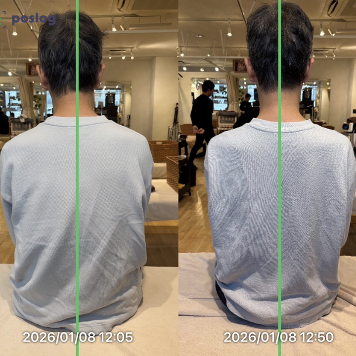 施術後は、肩周囲の重だるさが軽減し、首から肩にかけての動きが楽になったとのことでした。姿勢の変化も感じられ、「立った時の安定感が違う」とのお声をいただいています。