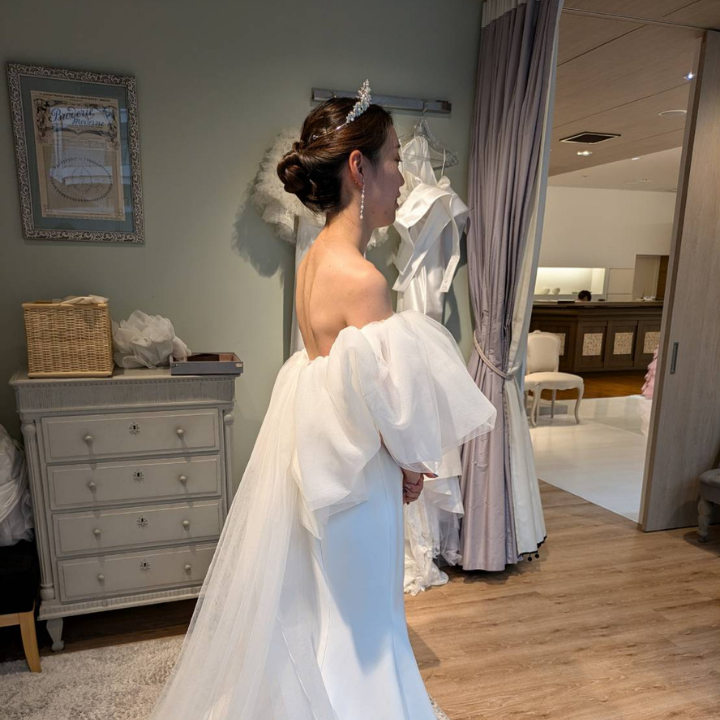 試着時の写真を確認すると、首だけでなく 巻き肩や猫背 の傾向もあり、「ドレス姿をもっと綺麗に見せたい」「挙式までに姿勢全体を改善したい」というご要望をいただきました。