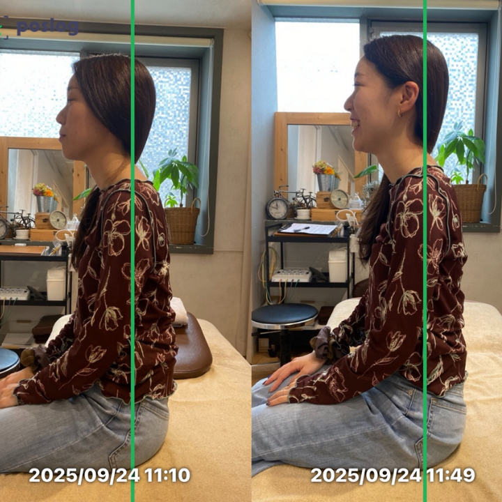 施術後は、首の位置が自然に後ろへ戻り、肩の巻き込みも軽減しました。患者様からは、「肩が開いて胸元がスッキリ見える!写真の印象が変わりそう」という嬉しいご感想をいただきました。