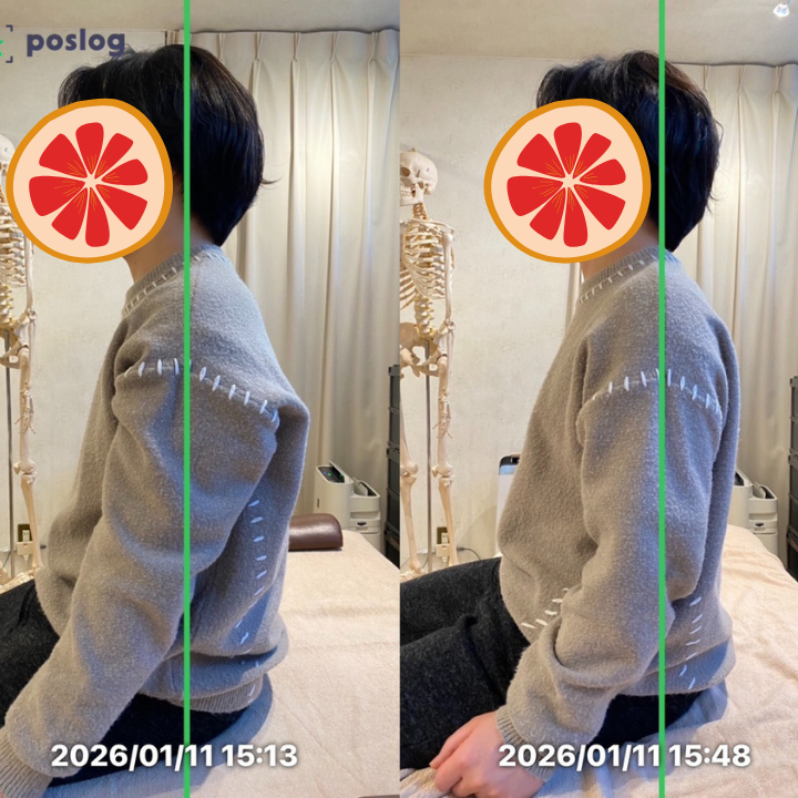 ヘルニアがある部位に過度な刺激を加えることは避けつつ、首だけに負担が集中しない身体づくりを目的に施術を行いました。具体的には、骨盤の位置調整、背骨全体のバランス調整、巻き肩と反り腰の改善、頚肩部から背部・腰部にかけての過緊張の緩和を中心に進めています。また、日常生活で無意識に出てしまう足を組む癖や、デスクワーク時の姿勢についても、「無理なく続けられる形」で意識できるポイントをお伝えしました。