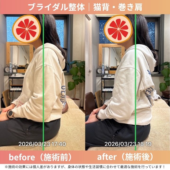 2026年4月19日に結婚式を控えており、前撮りの際にご自身の猫背と巻き肩が気になったことがきっかけで姿勢改善を意識。