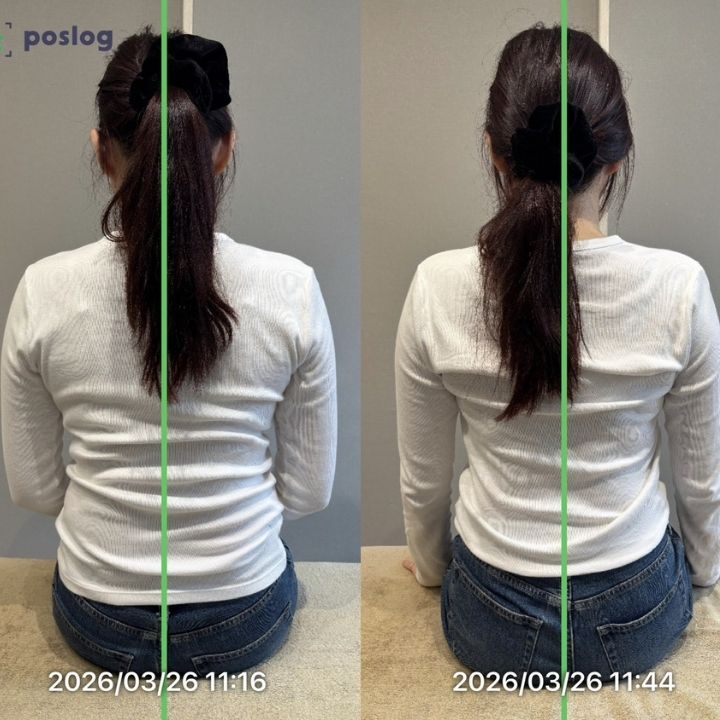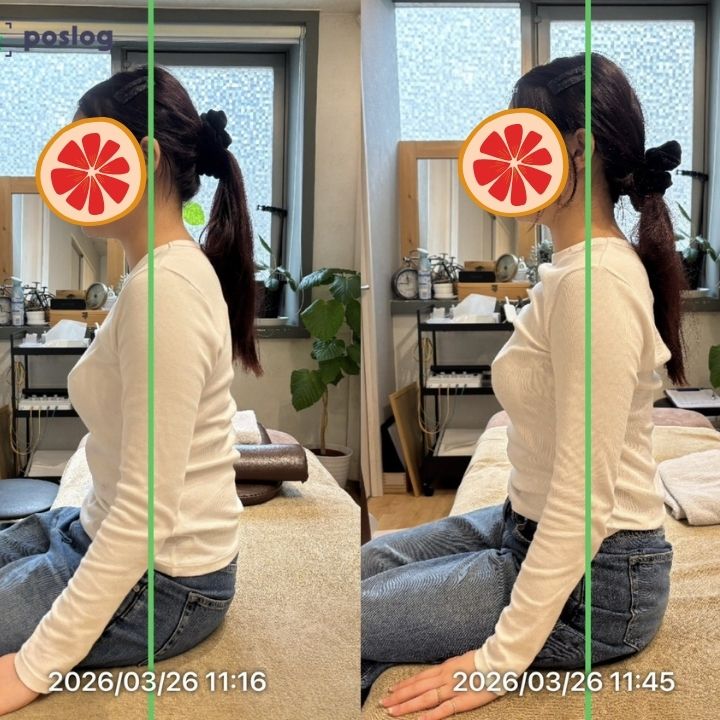施術後は、肩の位置が自然と下がり、上半身の厚みが軽減した印象に。
